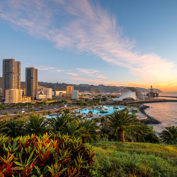 Tenerife, the largest of the seven islands that make up the Canary Island archipelago, lies between the 28th and the 29th parallel north and 16 and 17 degrees west. Slightly to the north of the Tropic of Cancer, situated in the center of the chain, between Gran Canaria, La Gomera and La Palma. The island is just over 300 km from the African coast, and about 1,300 km from the Spanish Mainland. It has an area of 2,034 km 2 and a strangely triangular shape, with the gigantic Pico del Teide rising up in the center to 3,718 metres, making it the highest point in all of Spain.